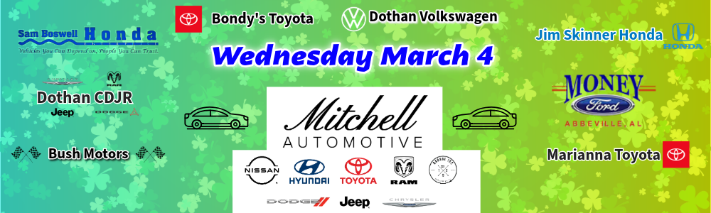 Mitchell Nissan, Mitchell Hyundai, Mitchell Dodge, Toyota of Dothan, Sam Boswell Honda, Bondy's Ford, Bondys Nissan, Star Imports, Bush Motors, and more!!